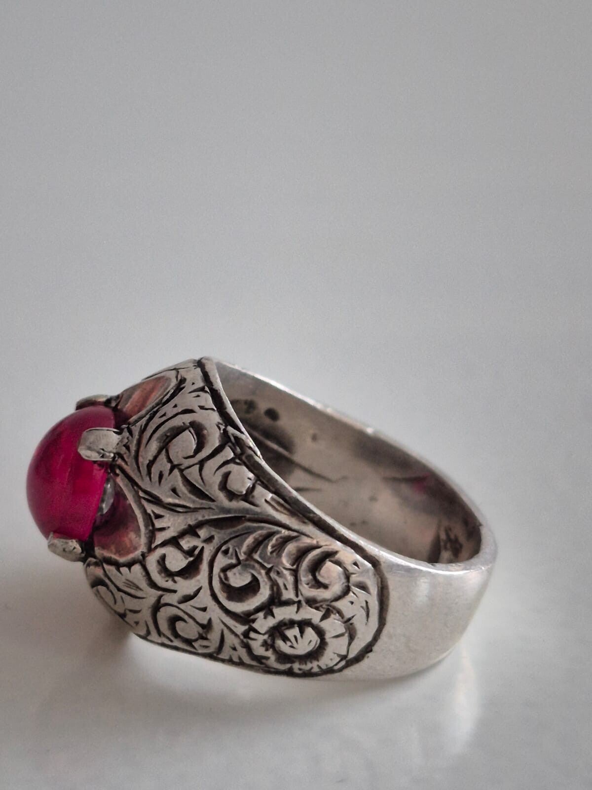 This elegant, handmade Afghan women’s ring features a natural pink tourmaline gemstone set in a beautifully engraved sterling silver band. Its intricate floral motifs reflect Afghan heritage and fine craftsmanship. The vibrant cabochon-cut tourmaline radiates warmth, love, and balance, making it a perfect statement piece for both everyday wear and special occasions.